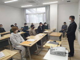 | 入校式で挨拶する甲斐教育育成委員長 |